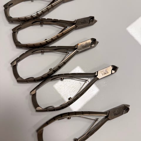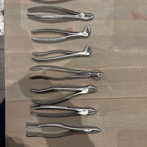 Sett med tannpleie-/kirurgiske instrumenter i metall, rustfritt stål. Bildene viser flere typer tenger, pinsetter og saks-lignende instrumenter med ulike spisser og vinkler. Egnet som tekniske presisjonsverktøy der det er behov for små grep og nøyaktig håndtering. Selges samlet slik som vist på bildene.