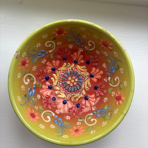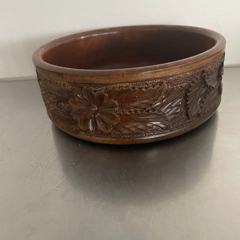 Perfect Home Collection bolle med blomsterdekor. Dekorativ serverings- eller pyntebolle med flerfarget blomstermotiv på innsiden og metallfarget utside. Formen er mykt avrundet med lett asymmetrisk kant. Egnet som fruktbolle, snacksbolle eller som dekorasjon på bord og benk. Materiale og nøyaktig størrelse er ikke oppgitt av produsent.