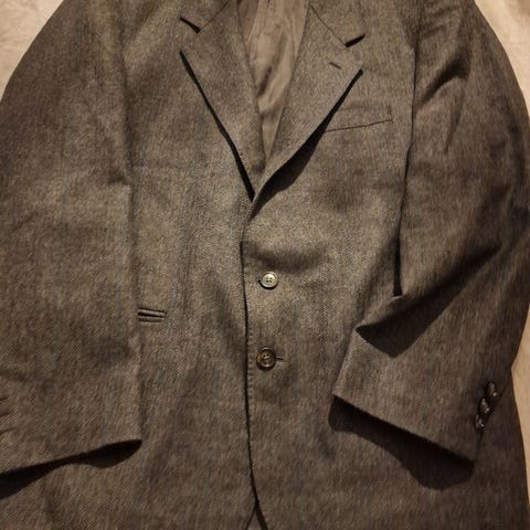Blazer / dressjakke / jakke i 100% ull, fiskebensmønster grå og svart. Størrelse 52. Kjøpt på vintage marked. Siste bilde gir riktigst farge. Hentes i Asker eller sendes mot porto.