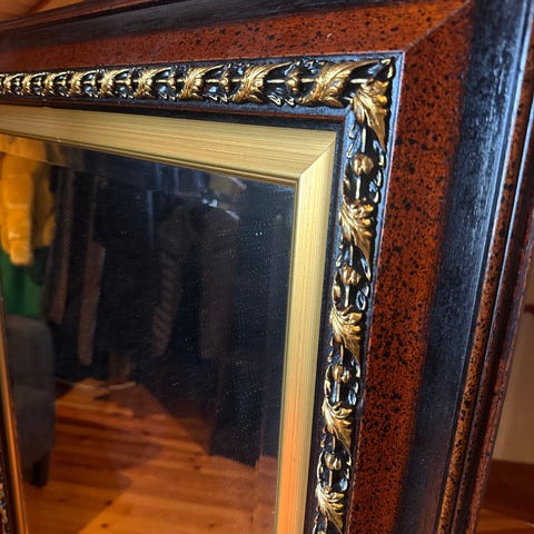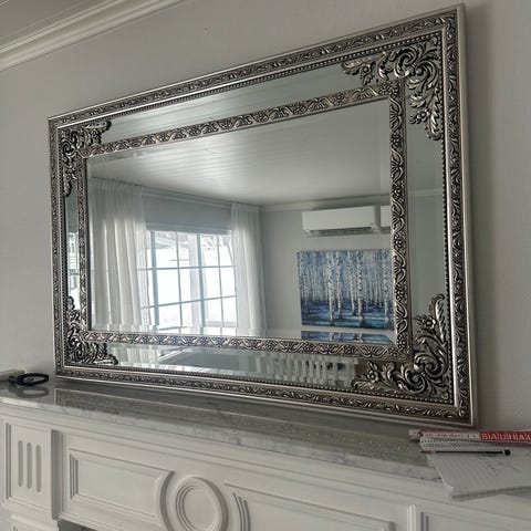 speil med dekorativ, bred ramme i sølvfarge. Rammen har utskårne detaljer og en indre mørk kant som rammer inn speilflaten. Passer til bruk i gang, stue eller soverom som veggspeil og interiørdetalj. Kan henges på vegg og gir et markert uttrykk i rommet.