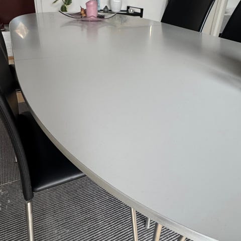 Vi har fått ny spisestue og selger derfor vårt flotte Piet Hein Ellipsebord og 4 stk Fritz Hansen 7er stoler i skinn. Det er bruksmerker på bordkanten og det kan forekomme bruksmerker på stolene.