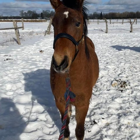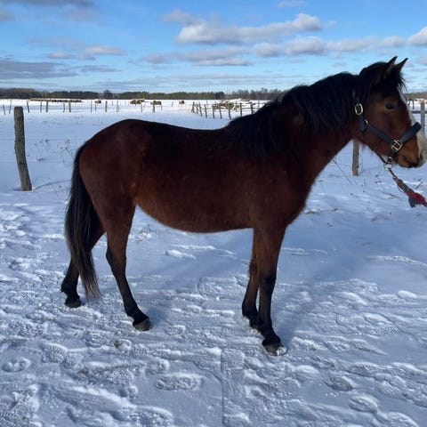 Titus er ikke innridd. Han står i flokk på utegang 24/7, barefoot. Som en ung hest gir han en fin mulighet til å formes og utdannes etter ny eiers ønsker.