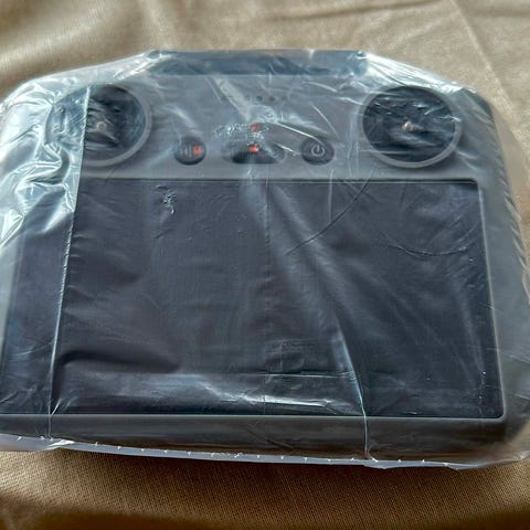 DJI-fjernkontroll i grå farge. Kontrolleren har to styrespaker, flere funksjonsknapper på fronten og indikatorlys. Egnet som fjernkontroll til kompatible DJI-droner, med ergonomisk utforming for to-hånds bruk.