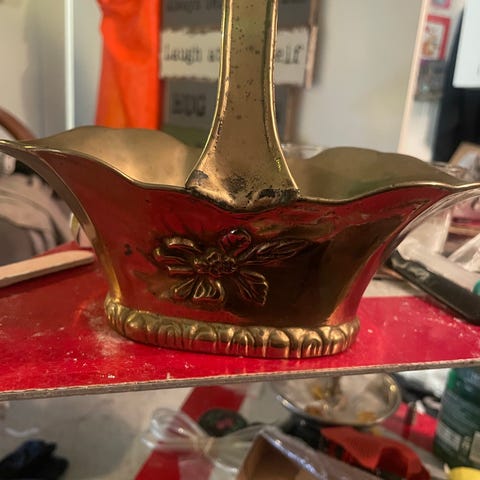 Flettet kurv / fat, av tau og metall.