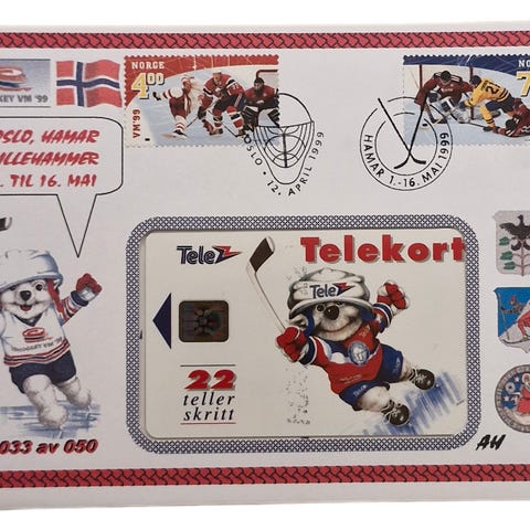Sett med telekort og tilhørende frimerker utgitt i forbindelse med ishockey-VM 1999. Motivet viser maskot og ishockeymotiv, samt norske flagg og turneringsreferanser. Telekortet har påskriften «22 tellerskritt» og er montert sammen med frimerkene på et ark med tittel «Ishockey VM ’99».