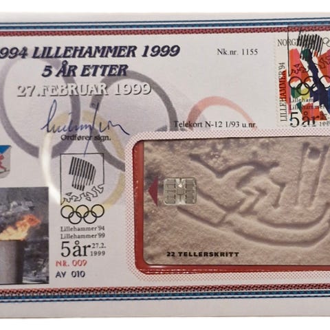 Tele2 telekort og frimerkesett med ishockeymotiv fra Lillehammer. Settet inneholder telekort med motiv av maskot i ishockeydrakt og tilhørende frimerker med ishockeymotiver. Kortet er merket med 22 tellerskritt. Leveres montert på informasjonsark med oversikt over frimerkenumre og telekortnummer. Egner seg som samleobjekt for telekort- og frimerkesamlere med interesse for ishockey og norsk motivbruk.