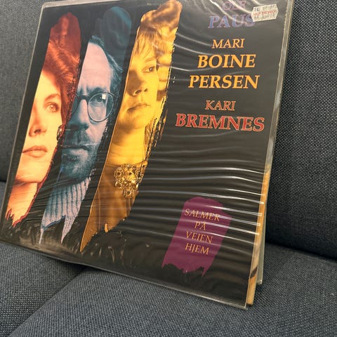 Vinylplate (LP) med Ole Paus, Mari Boine Persen og Kari Bremnes med tittelen «Salmer på veien hjem». Albumet er utgitt på etiketten For X For X. Standard svart vinylplate med trykt etikett på midten. Passer for avspilling på platespiller som støtter LP-format (33 1/3 rpm). Omslaget viser bilder av artistene og inneholder trykt informasjon og tekster.