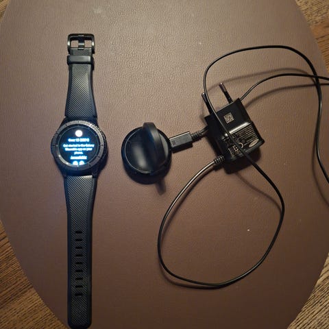 2 Samsung smartklokker med tilhørende lader i svart. Egnet til bruk sammen med kompatible Samsung-telefoner og andre enheter som støtter tilkobling til Samsung smartklokker.