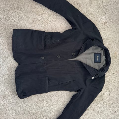 French Connection vinterjakke for herre i størrelse S. Jakken er svart og laget i ullmateriale med glatt fôr på innsiden. Klassisk, dobbeltspent front med krage og slag, samt lommer foran. Egnet som ytterjakke i den kaldere sesongen.
