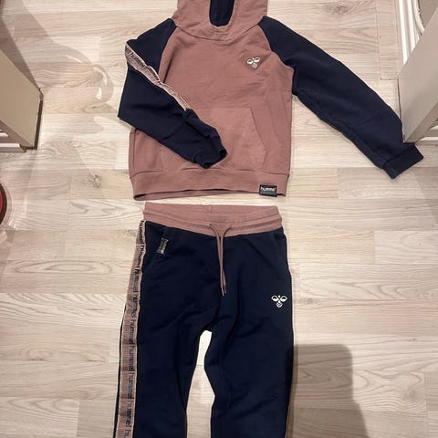 Fint brukt Hummel joggedress og genser str 122. Sett med hettegenser og joggedress med gulldetaljer. Mykt og behagelig materiale egnet til hverdagsbruk og aktivitet.