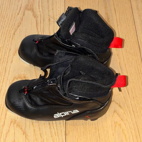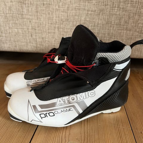 Atomic langrennsstøvler i svart med røde detaljer. Brukt maks 5 gang, fordi jeg ikke går på ski.