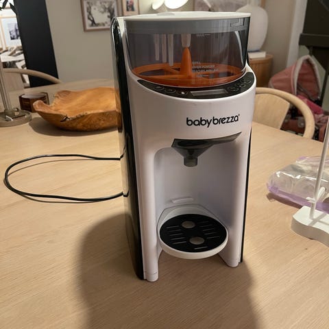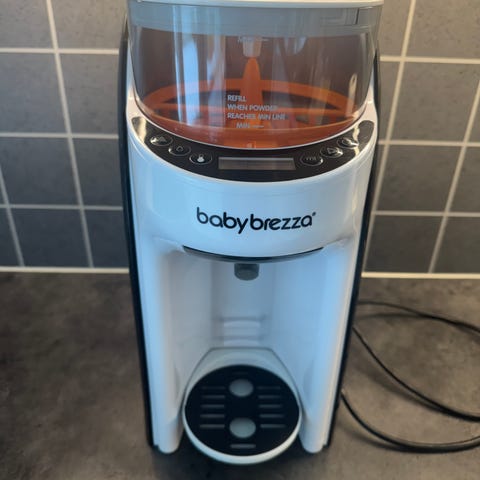 Baby Brezza Instant Warmer flaske- og grøtvarmer i hvit plast. Enheten holder vannet varmt i beholderen og gjør det mulig å tappe ut vann i ønsket temperatur direkte i tåteflaske eller kopp.