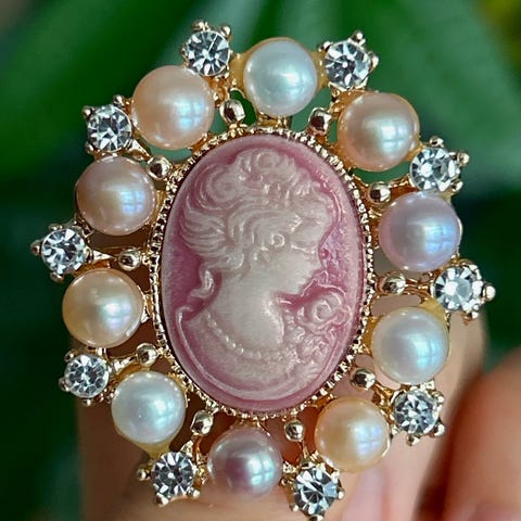 Vintage 14 karat gullring med skjellkameoer og fasetterte granater
