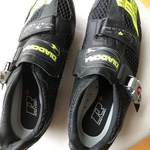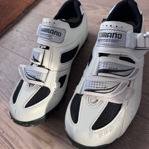 Bont A-Two sykkelsko i størrelse 38. Skoene er hvite med svarte detaljer og har justerbar lukking med borrelås og spenne. De er utstyrt med feste for klosser til klikksystem og har ventilasjonsfelter i overdelen. Egnet som sykkelsko til landevei eller trening der det brukes pedaler med klosser.