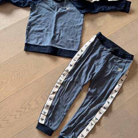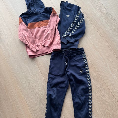 Hummel joggedress for jente i størrelse 122. Sett med hettegenser og joggebukse i flerfargede toner. Genseren har hette og Hummel-logo langs ermene. Buksen har lmatchende logobånd langs sidene. Egnet som hverdags- og fritidsplagg for barn. Buksen har ett mikroskopisk hull bak. Se bilde.