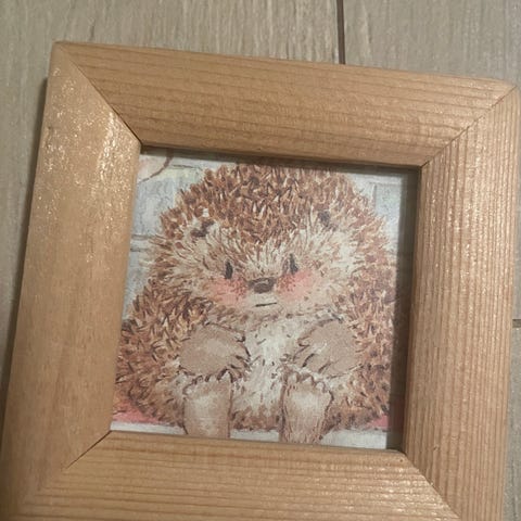 Print på fotopapir i hvit ramme, vedlagt hvitmalt staffeli som det kan stå på.