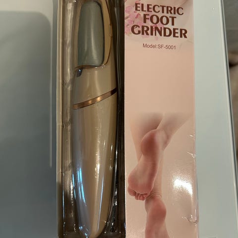 Elektrisk fotfil i rosa farge. Batteridrevet/USB-oppladbar enhet for fjerning av hard hud på føtter. Leveres med utskiftbare slipehoder/ruller og USB-ladekabel.