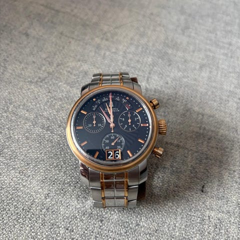 Flott hvit urskive med gulltonede visere og tall. Datovisning.