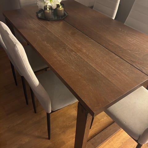 Møblene er pent brukt og godt vedlikeholdt, med normal bruksslitasje. Stabilt og stødig bord.
