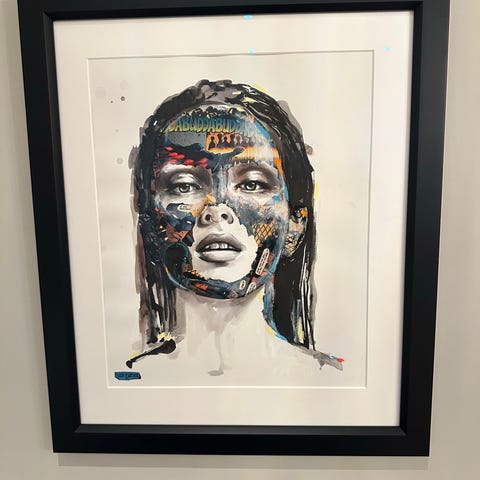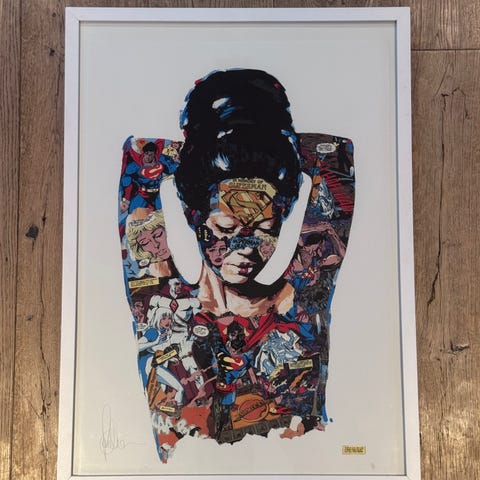Et tidlig arbeid fra kunstnerens anerkjente «La Cage»-serie, hvor hun kombinerer sterke kvinnelige portretter med ikonografi fra tegneserier og populærkultur – et gjennomgående og ettertraktet tema i hennes kunstnerskap.