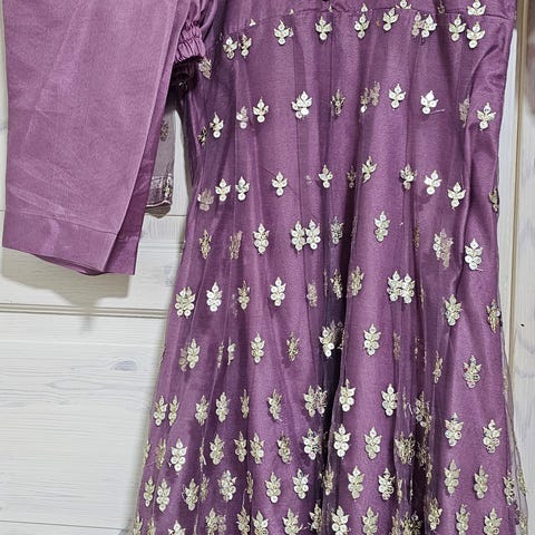 Plagget har sterk rosa bunnfarge med flerfargede broderier og speilaktige detaljer i gull- og metalltoner. Langermet overdel med dekorert halsutringning og kant nederst, samt tilsvarende dekor langs skjørtets nedkant. Passer til jente ca. størrelse 140, egnet til bruk ved høytider, feiringer og andre anledninger der man ønsker et tradisjonelt1274 inspirert antrekk.