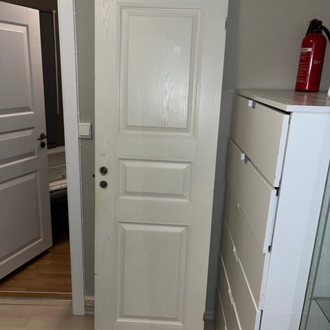 Innerdører i tre med lysbeiset overflate. To dører har glassfelt med sprosser (500.-) pr. stk. mens den andre har hel trepanel. (250.-) pr. stk. Dørene har klassisk profilering og leveres med karm og messingfarget dørhåndtak slik det vises på bildene. Egner seg som innerdør til bolig, hytte eller bod der man ønsker en tradisjonell treløsning med naturlig uttrykk og mulighet for innslipp av lys gjennom glassfeltet på to av dørene.
