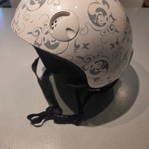 Slalom/alpinhjelm for barn selges (52-55cm). Hjelmen veier 550g. Den har noen bruksmerker, men de synes nesten ikke. På ørevarmerne og på den ene siden av hjelmen er det Frozen motiv. Hjelmen har også litt glitter på seg, men kan være litt vanskelig å se. Egnet til bruk ved slalom- og snowboardkjøring for barn.