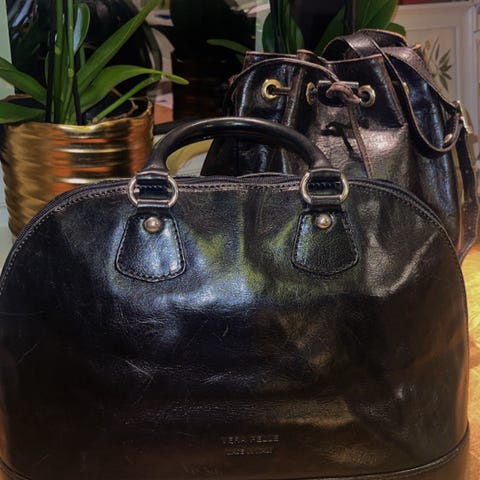 Selger en helt ubrukt sort skinnveske i strukturert skinn (Vera Pelle – Made in Italy).