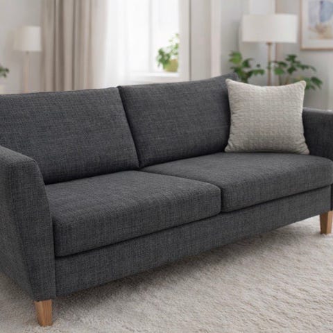 Selger en grå 2-seters tekstilsofa. Sofaen fremstår pen og hel, og er nylig renset, klar til bruk.