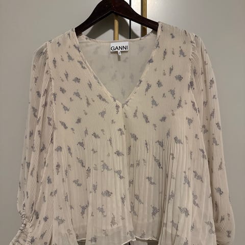 Nydelig bluse fra Ganni med v/-hals, plissé og blomstermønster. Pent brukt.
