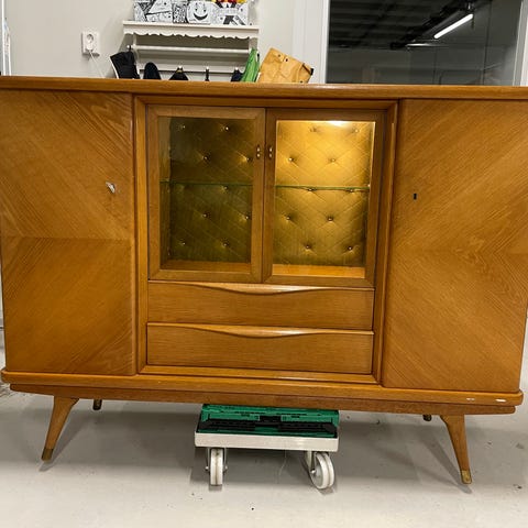 Kommode i tre i lys brun farge med tilhørende rektangulært speil. Kommoden har tre skuffer i midten, et skap med hylle på høyre side og et skap på venstre side. Topplaten er beskyttet med en glassplate. Speilet er avlangt og plassert løst oppå kommoden, men har feste til å henges opp. Møbelet gir god oppbevaringsplass til klær, tekstiler eller andre gjenstander, og kan brukes på soverom, gang eller stue. 2 nattbord i samme lyse tre og uttrykk. Det ene nattbordet har en liten skuffe, men begge nattbordene har skal og glassplate. Gis bort som vist på bildet og må hentes