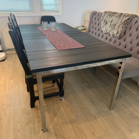 Pent brukt spisestue gruppe, med bord, tilhørende 6 stoler og 2 illeggplater.