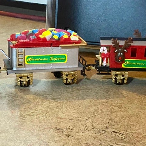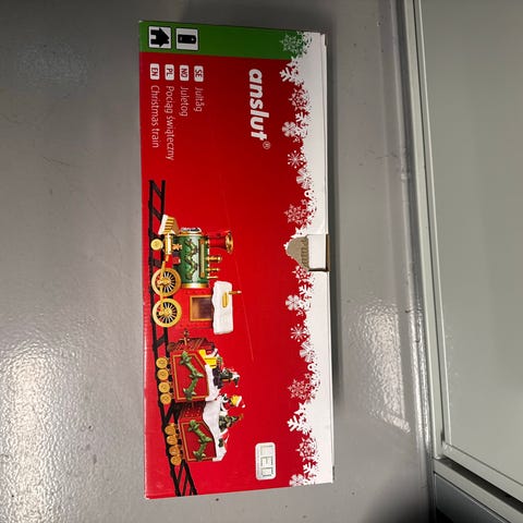Selger et søtt, lite juletog, det består av 1 lokomotiv med julenisse og 3 vogner som henger sammen med en lenke. Plass til totalt 4 telys.