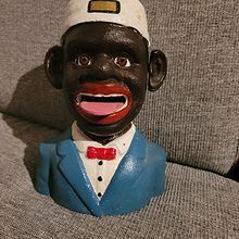 Gammel,sær og spesiell sparebøsse for mynter,aldri sett maken. Tror den er i keramikk. Står noe preget i godset på ryggen,som jeg ikke klarer tyde. Se bilder for detaljer og tilstand. Det kommer iallefall ikke penger når han gjør sitt fornødende,så de må nok puttes på. Kan sendes mot porto 69 kr.