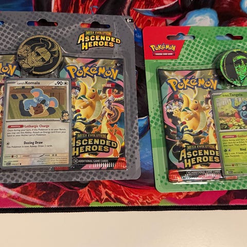 Pokémon Ascended Heroes samlekort boosterpakker med promo-kort og mynt.