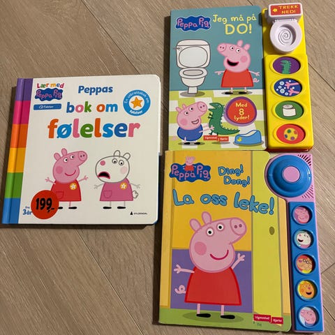 Pakken inneholder flere kartongbøker med motiver fra Peppa Pig-universet, blant annet bøker om brannbil, hverdagsaktiviteter og do-trening. Bøkene har tykke sider som er enkle for små hender å bla i, og noen av bøkene har enkle aktivitets- eller lydknapper. Egner seg for høytlesning og tidlig språkutvikling for små barn som liker Peppa Pig.