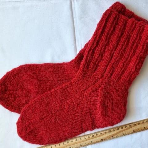 Håndstrikkede sokker fra 1960 tallet som aldri har vært brukt, helt strøkne. Nydelig rødfarve