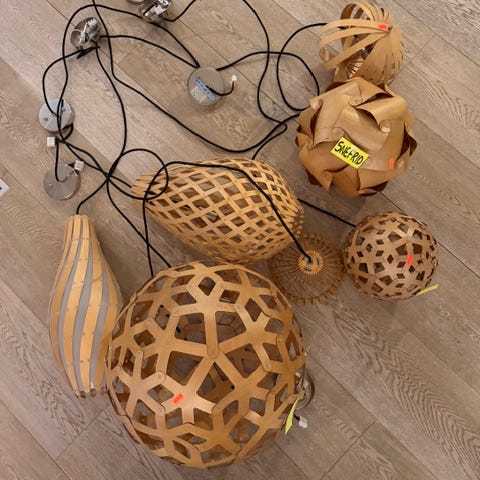 Selger en flott pendellampe i tre (Woody-stil).