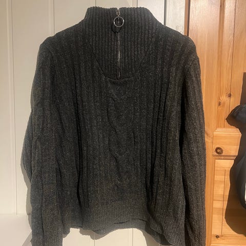 Cubus genser for dame i størrelse M. Genseren er grå og strikket i en ullblanding, med strukturmønster foran. Den har høy hals med glidelås og ribbestrikkede kanter nederst og på ermene. Passer til hverdagsbruk og som et ekstra lag på kjølige dager.