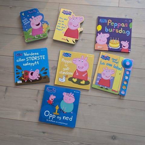 Bøkene er illustrerte bildebøker for barn, med stive permer og fargerike tegninger fra Peppa Pig-universet. Passer for høytlesning og egenlesning for mindre barn som liker Peppa Pig.