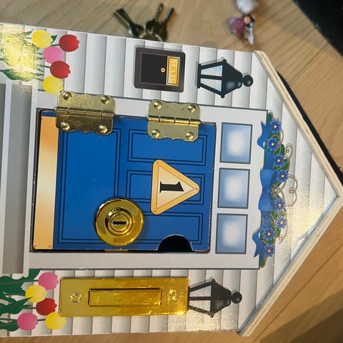 Selger lekehus fra Sprell. Pent brukt. Fire dører med ringeklokker og hver sin nøkkel som hører til. 4 figurer hører med.