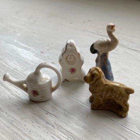 Settekasse figurer / figurer til settekasse / småting i slipt glass / miniatyrer i glass / småting / miniatyr saltkar / gamle saltkar / vintage miniatyrer settekasse / miniatyrgjenstander