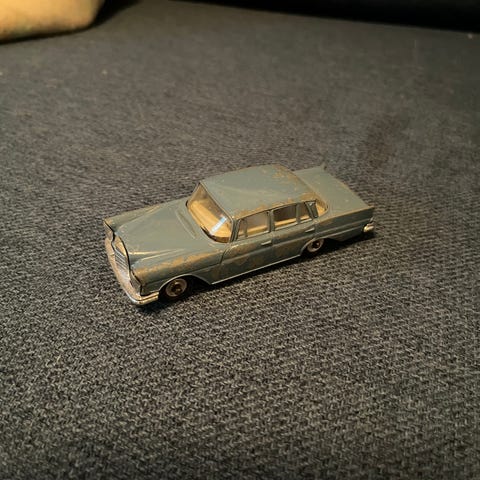 Dinky Toys modellbiler samling med flere klassiske bilmodeller. Samlingen omfatter blant annet Volvo 122S, Studebaker, Citroën 2CV, Volkswagen Karmann Ghia og Borgward Isabella.