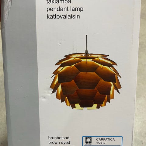 Taklampe fra Aneta Lightning. Trefarget/ brunbeiset. Kan være at treplatene/delene bør festes bedre i sporene sine, da det har hendt at enkelte har løsnet. Kanskje de kan limes? Lampen er akkurat demontert, ble litt upraktisk der den hang - lett å komme borti, selv om den er veldig fin å se på. E27-sokkel.