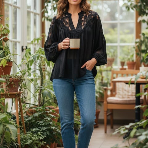 Blusen er svart og laget av bomull. Den har broderie anglaise-lignende hullmønster i stoffet og voluminøse ermer med strikk nederst. V-utringning foran og rett fasong.