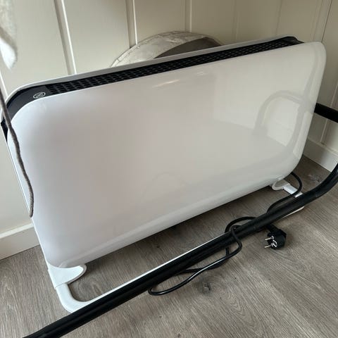 Hvit panelovn med digital termostat og display. Ovnen har integrert kontrollpanel med knapper for temperaturjustering og ulike driftsmoduser. Leveres med veggfester som vises på bildene. Egnet som elektrisk oppvarmingskilde i rom som stue, soverom eller kontor. Strømkabel med støpsel for tilkobling til vanlig stikkontakt.