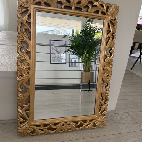 Godt brukt speil, burde males. Selles billig, er blitt brukt som sminkespeil! Helst kom og hent det!