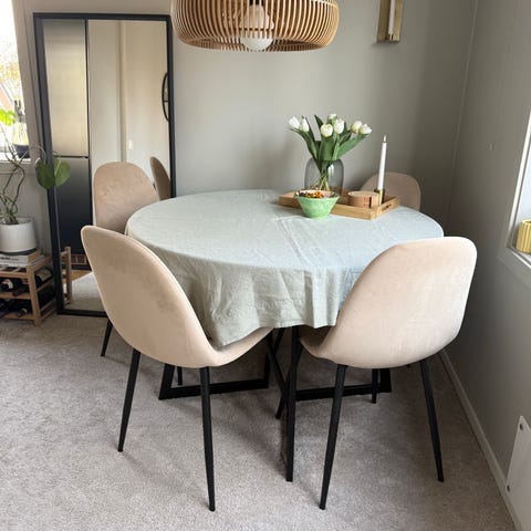 Rundt bord med søylefot, egnet som spisebord i kjøkken eller spisestue. Bordet har plass til flere stoler rundt og passer til daglig bruk eller som samlingspunkt i oppholdsrom. Bordduk og øvrig interiør på bildene følger ikke med, men viser mulig bruk og plassering i hjemmet.
