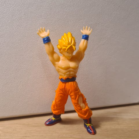 Dragon Ball Z figur i plast i flere farger. Figuren forestiller en karakter i oransje og blå drakt med gult hår, sittende på en grå skystøtte og holdende en lys kule. Laget i hard plast med åpning i bunnen. Egnet som samleobjekt eller pynt for fans av Dragon Ball Z.Denne figuren forestiller Super Saiyan Goku fra Dragon Ball Z. Den er en del av en vintage-serie, opprinnelig produsert rundt 1989 av selskaper som AB Toys og Bird Studio/Shueisha/Toei Animation.