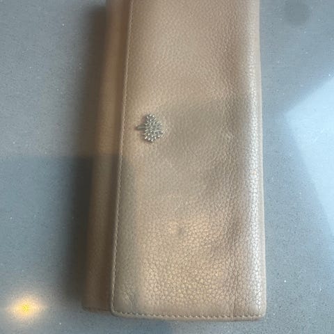 Vintage Mulberry lommebok i lær for dame. Lommeboken er i grønt skinn med preget mønster og har glidelåslukking rundt kanten. På utsiden er det en dekorativ rem med stor metallspenne. Innvendig har lommeboken flere kortlommer, rom for sedler og rom for mynter. Kvittering fra Mulberry butikken i Oslo medfølger.